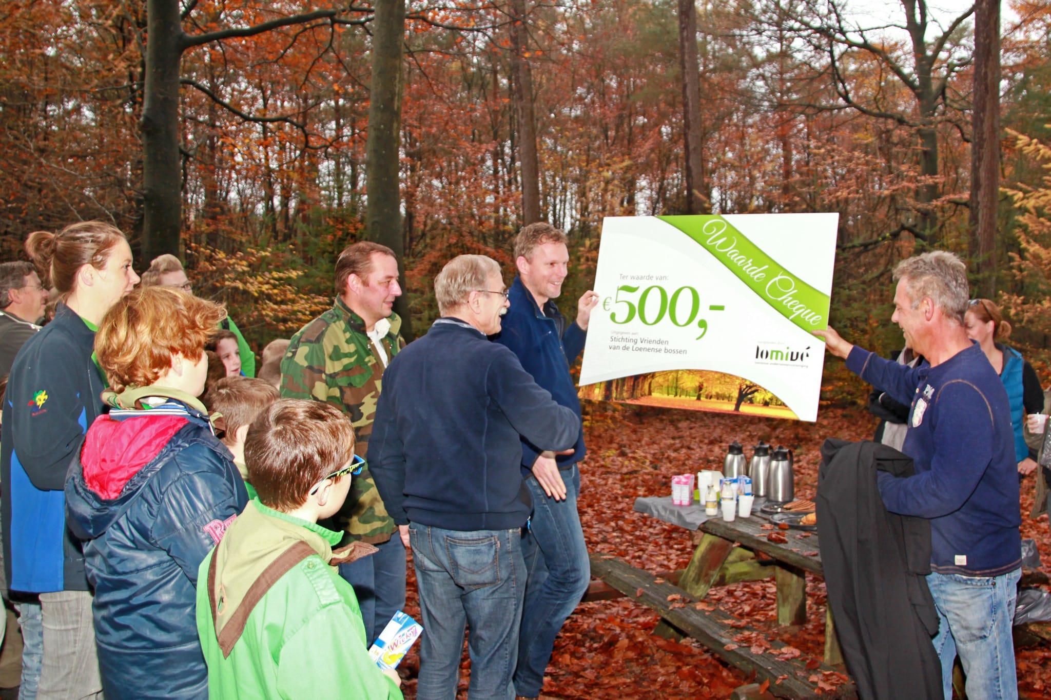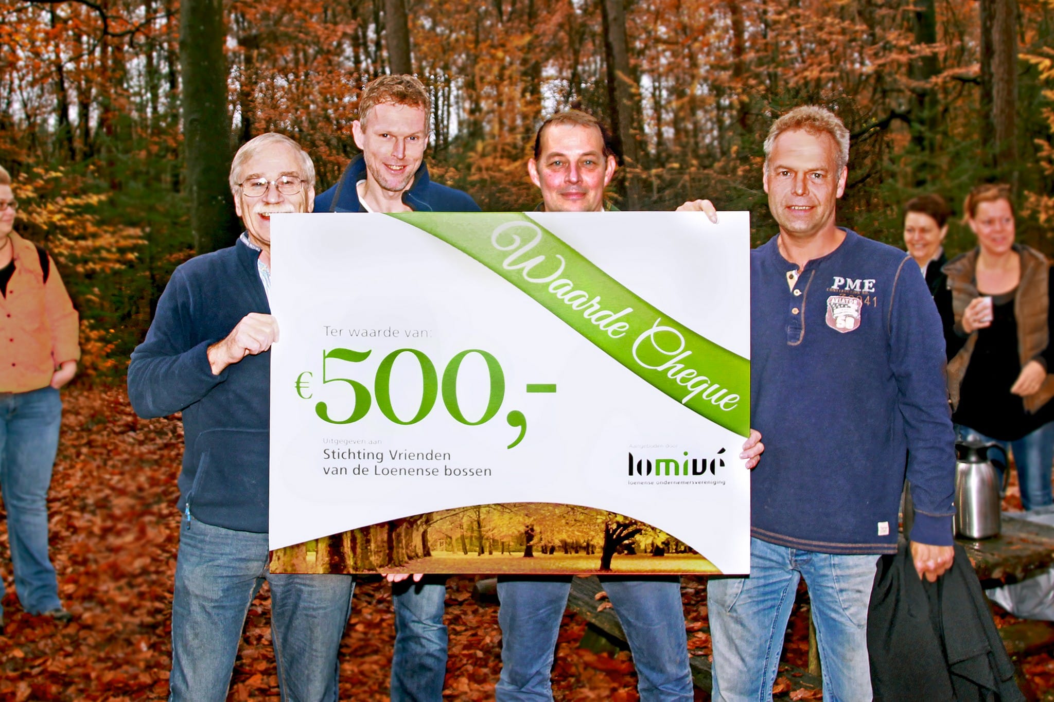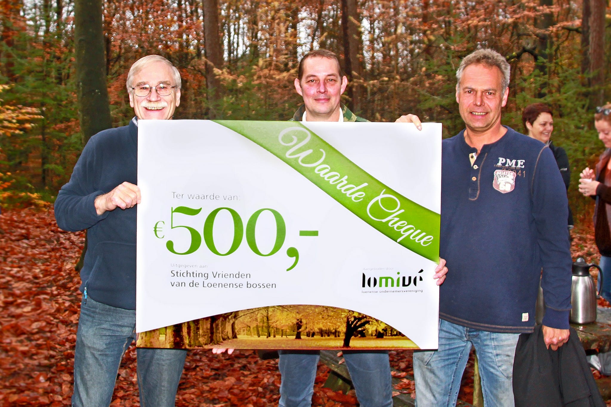 Bij aanvang waren er circa 60 vrijwilligers die de handen uit de mouwen kwamen steken. Er werd begonnen met een bak koffie. Nadat Gerrit van de Sprenge een welkomstwoord hield. Kwam Lomivé met een verassing en reikte een waardecheque uit t.w.v. 500 euro aan de Stichting Vrienden van de Loenense bossen. Dit ter ondersteuning van de toekomstplannen, één hiervan is het realiseren van een uitkijktoren op de trapjesberg.
